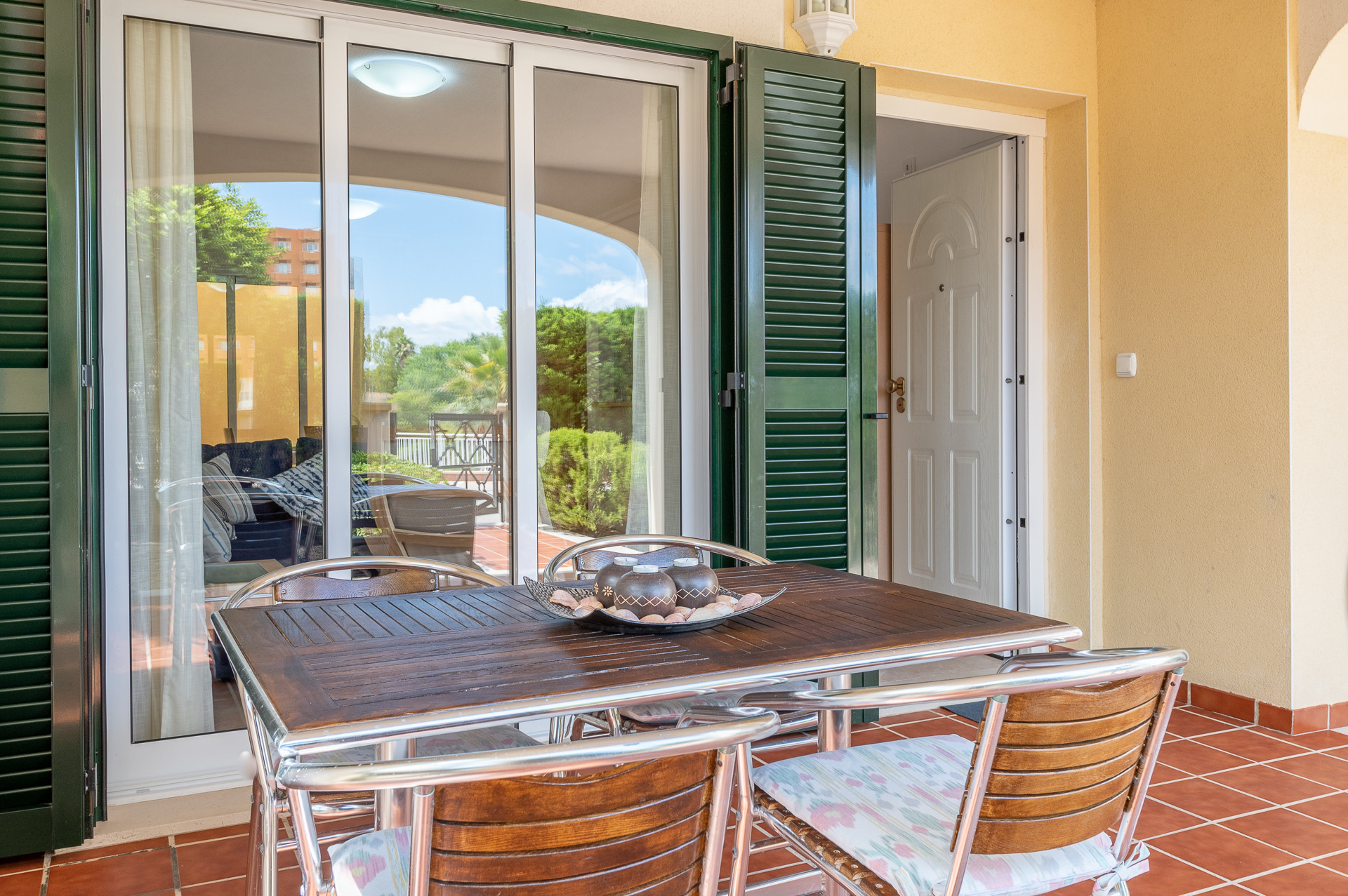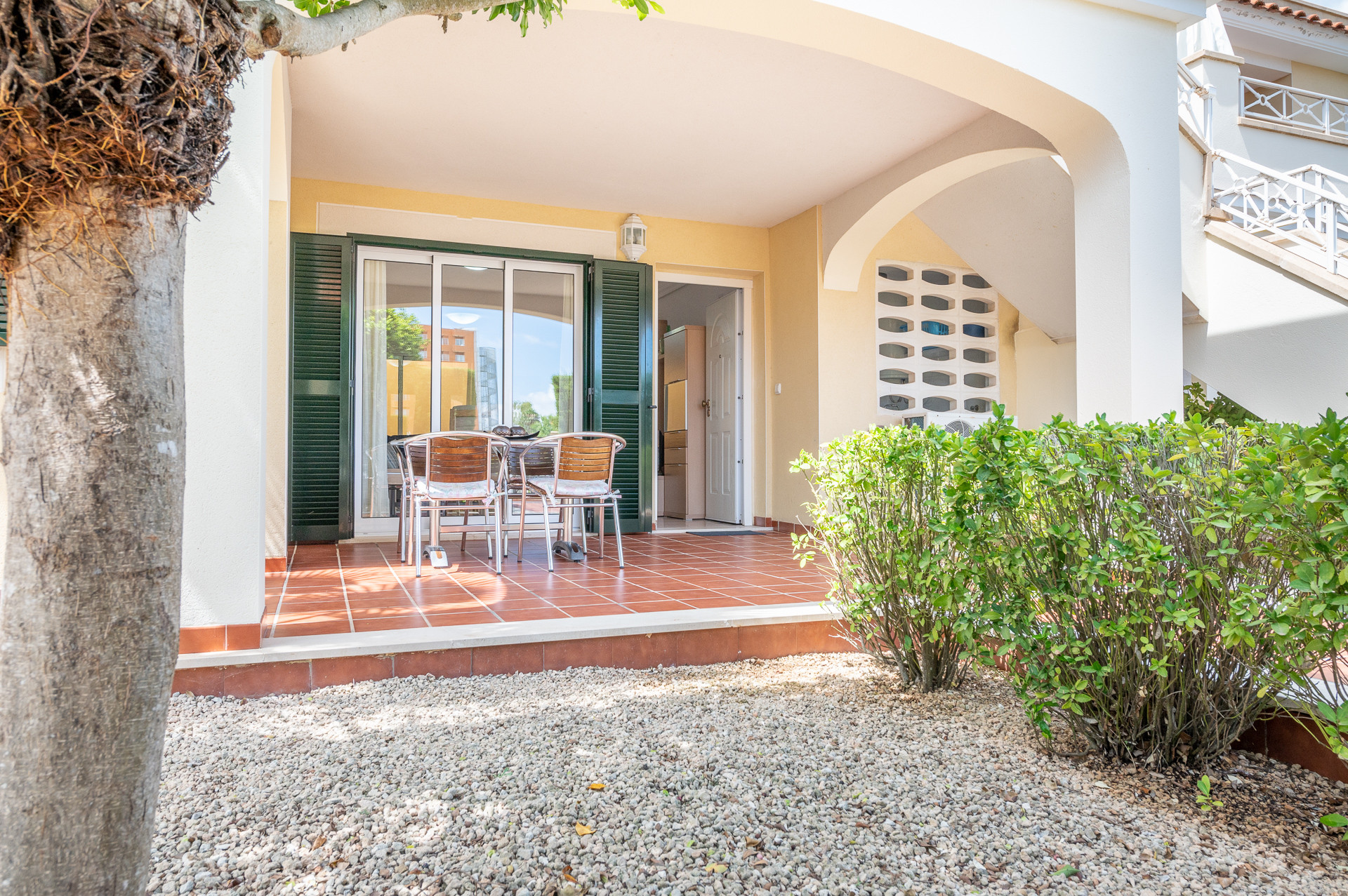 Este apartamento está situado en la planta baja de un bloque de apartamentos denominados Es Mirador, tiene un bonito jardín alrededor de la casa con plaza de parking, palmeras y una terraza cubierta con un chillout. La piscina comunitaria frente a la casa es muy grande más de 15 metros de largo, piscina para niños, y 2 jacuzzis.